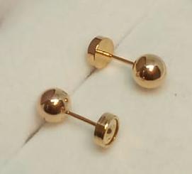 Aros abridores de pelotita de oro de 5mm, para recién nacida y niñas hasta los 4 años. Hipoalergénicos, en oro de 14 kilates y tuerca a presión de seguridad. Ideales para la clínica.